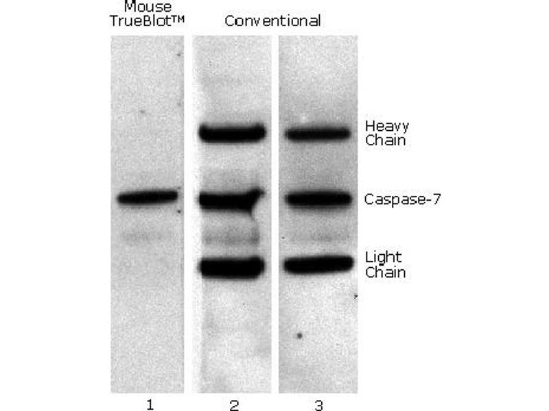 Mouse IgG TrueBlot® ULTRA is ideal for use in protocols involving immunoblotting of immunoprecipitated proteins. Mouse IgG TrueBlot® ULTRA preferentially detects the non-reduced form of mouse IgG (IgG1, IgG2a, IgG2b, IgG3) over the reduced, SDS-denatured form of IgG. When the immunoprecipitate is fully reduced immediately prior to SDS-gel electrophoresis, reactivity of Mouse IgG TrueBlot® ULTRA with the 55 kDa heavy chains and the 23 kDa light chains of the immunoprecipitating antibody is minimized thereby eliminating interference by the heavy and light chains of the immunoprecipitating antibody in IP/immunoblotting applications. Applications include studies examining post-translational modification (e.g., phosphorylation or acetylation) or protein-protein interactions. Mouse TrueBlot® ULTRA has been reported for use in immunoblotting (WB).