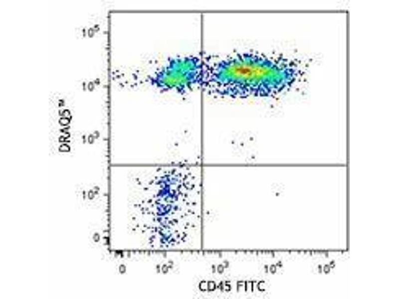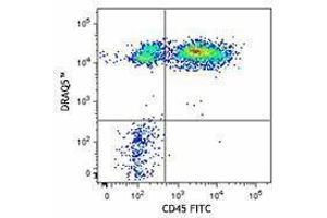 - DRAQ5™ is a far-red emitting, anthraquinone compound that stains nuclei in live cells. It is permeant to live cells and thus can be used for cell cycle analysis and/or staining of nucleated cells. It is optimally excited at 568 nm, 633 nm, and 647nm and can be detected using 695LP, 715LP, and 780LP filters. DRAQ5™ can also be used in cell imaging and is a good replacement for DAPI, as it does not get excited by UV or Violet lasers and is sub-optimally excited by the 488 nm laser. DRAQ5™ can be combined with FITC, PE, and other UV or violet excitable dyes for multi-color analysis.