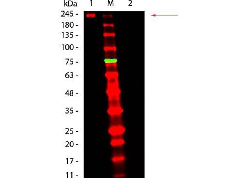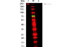 Application Note: Fluorescent Mouse TrueBlot® Antibody DyLight™ 680 may also be used for detection in immunoassays that do not employ immunoprecipitation. Fluorescent Mouse TrueBlot® Antibody DyLight™ 680 is provided as a lyophilized powder. To conserve reagent, we recommend incubating the blots from minigels in sealed bags (removing as much air as possible) with minimal volume (2-3 mLs). If used conservatively at 2.5mls/blot will yield enough reagent for 40 blots. Note that there are three key procedural considerations: 1. Protein A or G beads may be used with the mouse, goat and sheep TrueBlot secondaries, but not with the rabbit TrueBlot secondary. Use of protein A or G beads with the rabbit TrueBlot will result in contaminating bands. 2. Immunoprecipitate should be completely reduced. 3. MB-070 Blocking Buffer for Fluorescent Western Blotting should be used as the blocking protein for the immunoblot. Note: To achieve best results when detecting mouse IgG1 subtypes, we recommend performing a dot blot or titration to determine the optimal dilution factor for your desired application. All recommended dilutions for listed applications are intended as an initial recommendation, specific conditions for each protein and antibody combination should be specifically optimized by the end user.