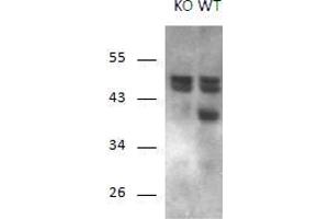 Western Blot: Approx 40 kDa band corresponding to isoform 1L observed in Mouse Brain lysates and this band is not present in the KO mouse. Additional bands around 55 kDa were consistently observed, however these band were also observed in the KO mice and