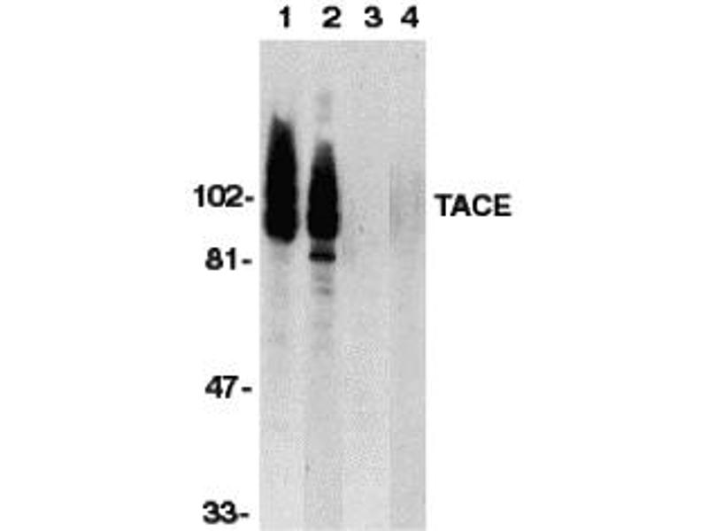TACE antibody can be used for detection of TACE by Western blot at 0.5 - 1 μg/mL. For immunocytochemistry use 10 μg/mL.