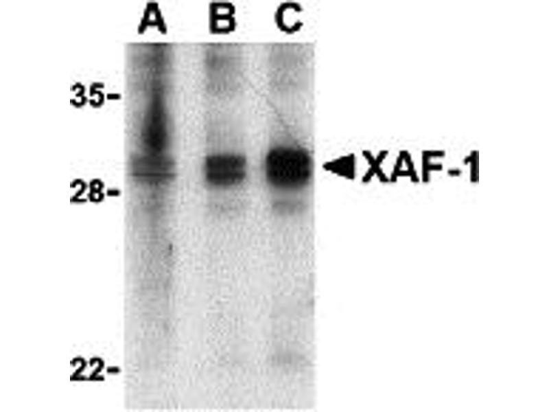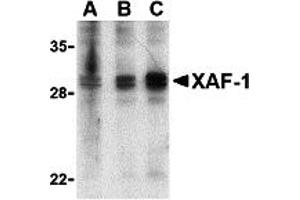 XAF-1 antibody can be used for the detection of XAF-1 by Western blot at 1-2 μg/mL. Multiple isoforms of XAF-1 exist and a doublet at approx. 30 kDa can be seen using anti-XAF-1 (IN).