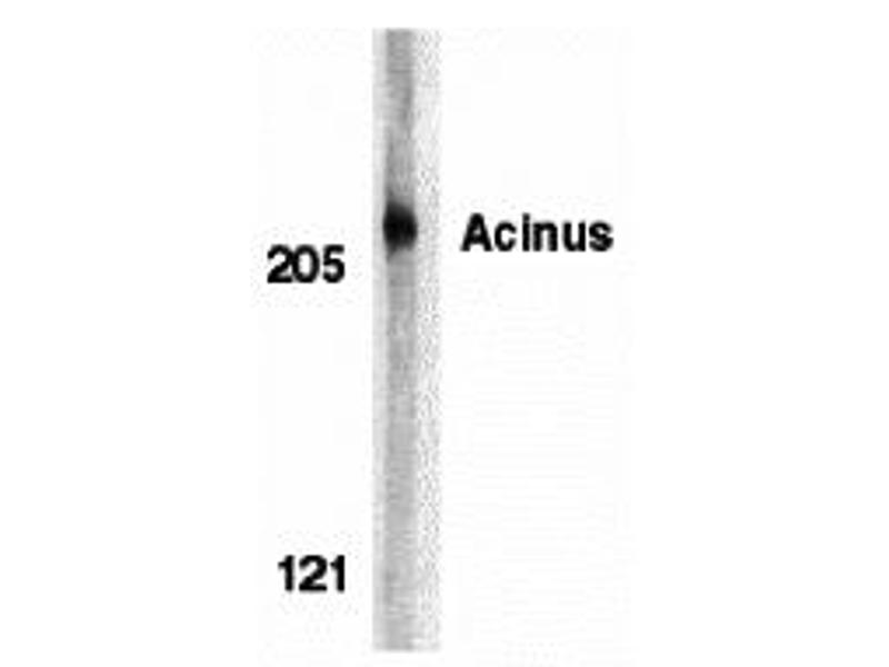 Acinus antibody can be used for detection of acinus by Western blot at 0.5 to 1 μg/mL. An approximate 220 kDa band can be detected.
