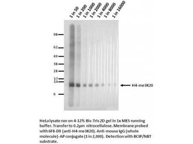 - Specific for K20 tri-methylated histone H4, weak cross-reactivity with K20 di-methylated histone H4, but not mono- or unmethylated K20, no cross-reactivity with histone H3