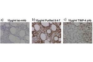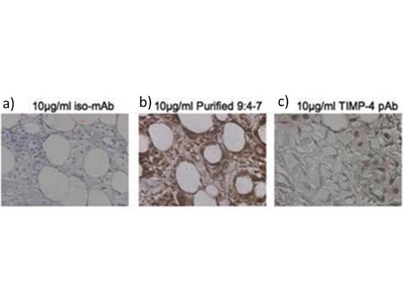 : "Development of a monoclonal antibody that specifically detects tissue inhibitor of metalloproteinase-4 (TIMP-4) in formalin-fixed, paraffin-embedded human tissues." in: Journal of cellular biochemistry, Vol. 110, Issue 5, pp. 1255-61, (2010) (PubMed).