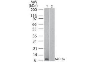 - Anti-MIP-3α was purified from clarified mouse ascetic fluid by Protein A chromatography followed by extensive dialysis against the buffer stated above.