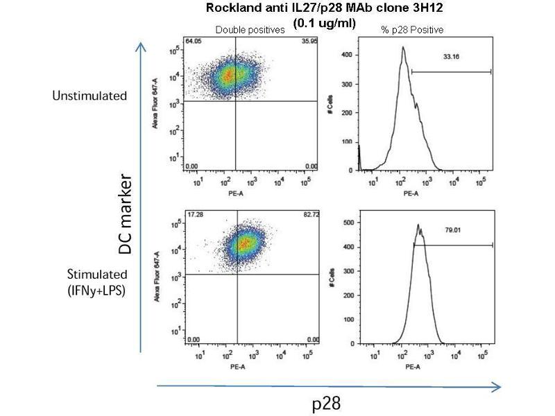 Application Note: IL-27 is expressed in activated antigen presenting cells including monocytes, endothelial cells, and dendritic cells, for example mouse CD4 splenocytes. This purified antibody has been tested for use in Flow Cytometry, ELISA and western blotting. Specific conditions for reactivity should be optimized by the end user. Expect a band approximately 26 KDa in size corresponding to the mature mouse p28 protein, a non-glycosylated polypeptide chain consisting of amino acids, by western blotting in appropriate cell lysate or extract.