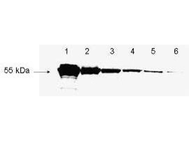 Increasing amounts of lysates from HeLa cells transiently expressing DYKDDDDK-tagged THOC1 were separated on an SDS-PAGE and revealed using ABIN99294 as decribed in the protocol section (lanes 3 to 7). Transiently expressed DYKDDDDK-tagged THOC5 can is also be detected using ABIN99294 (lane 1). Untransfected HeLa cell extracts were used as negative controls (lane 2).