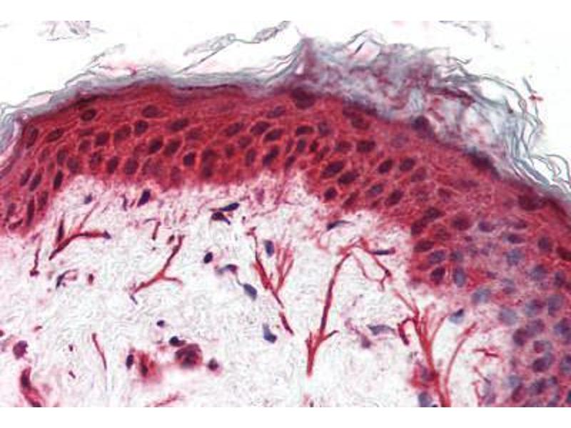 Usage: Immunohistochemistry: This antibody was validated for use in immunohistochemistry on a panel of 21 formalin-fixed, paraffin-embedded (FFPE) human tissues after proteinase K antigen retrieval. After incubation with the primary antibody, slides were incubated with biotinylated secondary antibody, followed by alkaline phosphatase-streptavidin and chromogen. The stained slides were evaluated by a pathologist to confirm staining specificity. The optimal working concentration for this antibody was determined to be 3-5 μg/mL. -