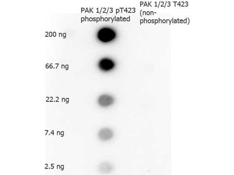 Application Note: This phospho specific polyclonal antibody was tested by Dot blot and ELISA and was found to be reactive with the phosphorylated form of the immunizing peptide and minimally reactive with the non-phosphorylated form of the immunizing peptide. Although not tested, this antibody is likely functional in immunohistochemistry, immunoblotting, and immunoprecipitation. Lysates from Jurkat cells or PAK transfected cells may be used as a control. This product has been assayed against 0.1 μg of phosphorylated peptide in a standard capture ELISA using TMB (3,3',5,5'-Tetramethylbenizidine) code # TMBE-100 as a substrate for 30 minutes at room temperature. A working dilution of 1:5,000 to 1:25,000 is suggested for this product. Less than 0.2 % cross-reactivity was detected against the non-phosphorylated form of the immunizing peptide. Researchers should determine optimal titers for other applications.