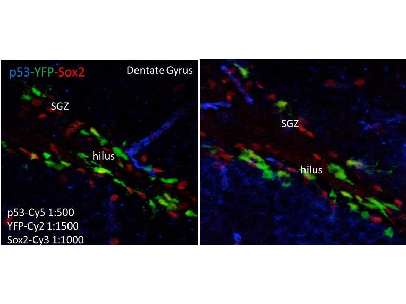 Application Note: Anti-p53 has been tested by western blot and immunofluorescence and is suitable for ChIP, flow cytometry, immunohistochemistry, Immunofluorescence, immunoblotting and immunoprecipitation. p53 is the most commonly mutated gene in spontaneously occurring human cancers. Mutations arise with an average frequency of 70 % but incidence varies from zero in carcinoid lung tumors to 97 % in primary melanomas. High concentrations of p53 protein are transiently expressed in human epidermis and superficial dental fibroblasts following mild ultraviolet irradiation. This antibody reacts with an N-terminal epitope of the 53 kD gene product and this epitope is not destroyed by formalin-fixation and routine paraffin embedding. Microwaving is needed for optimal staining.