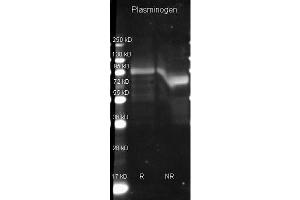 Application Note: Anti-Plasminogen antibody has been tested by ELISA and western blot. This antibody is assayed against 1.0 μg of Plasminogen in a standard capture ELISA using Peroxidase Conjugated Streptavidin #S000-03 and ABTS (2,2'-azino-bis-[3-ethylbenthiazoline-6-sulfonic acid]) code # ABTS-100 as a substrate for 30 minutes at room temperature. A working dilution of 1:4,000 to 1:20,000 of the reconstitution concentration is suggested for this product.