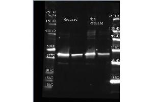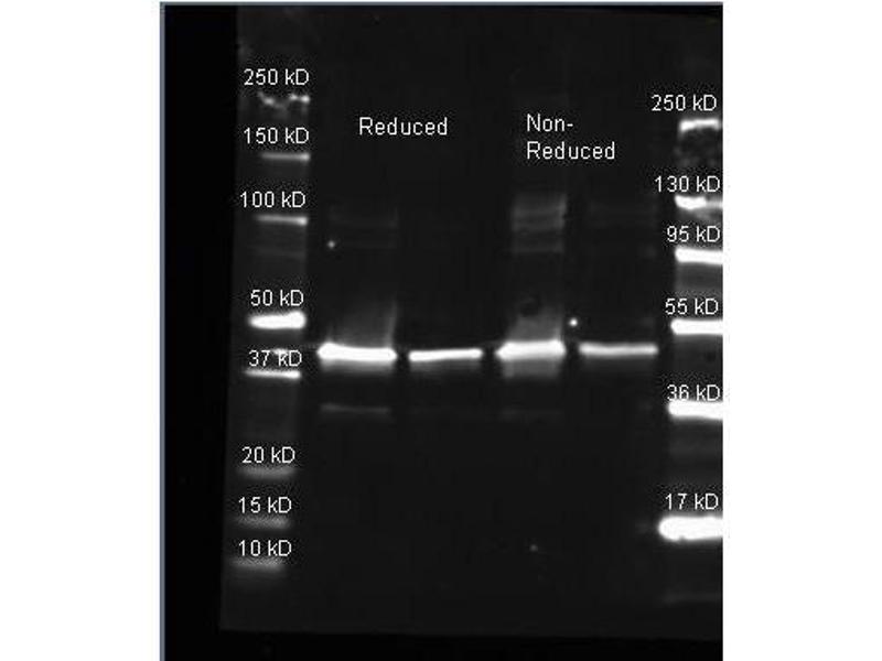 Application Note: Anti-Sarcosine Oxidase Biotin Conjugated Antibody has been tested by ELISA and western blot. This product is suitable to be assayed against 1.0 μg of Sarcosine Oxidase in a standard capture ELISA using Peroxidase Conjugated Streptavidin #S000-03 and ABTS (2,2'-azino-bis-[3-ethylbenthiazoline-6-sulfonic acid]) code # ABTS-100 as a substrate for 30 minutes at room temperature. A working dilution of 1:4,000 to 1:20,000 of the reconstitution concentration is suggested for this product.