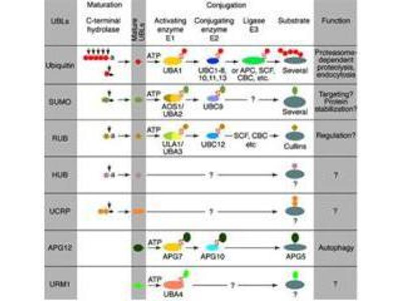 - Background: Ubiquitin-like proteins fall into two classes: the first class, ubiquitin-like modifiers (UBLs) function as modifiers in a manner analogous to that of ubiquitin. Examples of UBLs are SUMO, Rub1 (also called Nedd8), Apg8 and Apg12. Proteins of the second class include parkin, RAD23 and DSK2, are designated ubiquitin-domain proteins (UDPs). These proteins contain domains that are related to ubiquitin but are otherwise unrelated to each other. In contrast to UBLs, UDPs are not conjugated to other proteins. Urm1 is a newly identified ubiquitin related modifier. Urm 1 is a 99-amino acid protein terminated with glycine-glycine. Target proteins are conjugated to Urm1 via its C-terminal glycine. Initially Urm1 forms a thioester with a novel E1-like protein, Uba4.