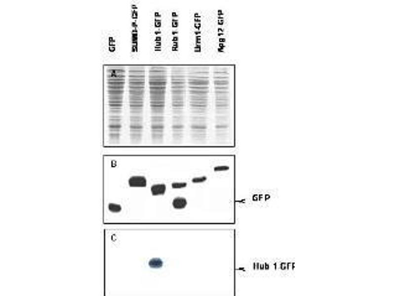 Application Note: This purified polyclonal antibody reacts with yeast Urm1 by western blot and ELISA. Although not tested, this antibody is likely functional in immunohistochemistry and immunoprecipitation. This antibody using the specified conditions may recognize other prominent intrinsic bands (UBLs or their conjugates). Other intrinsic bands are readily detectable in yeast lysates at lower antibody dilutions. For immunoblotting a 12 kDa band corresponding to yeast Urm1 is detected. Most yeast cell lysates can be used as a positive control without induction or stimulation.