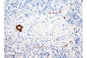 The antibody recognizes cytokeratins nos. 7, 17 and 19 typical for many simple epithelial cells but is found also in cells in squamous epithelia.