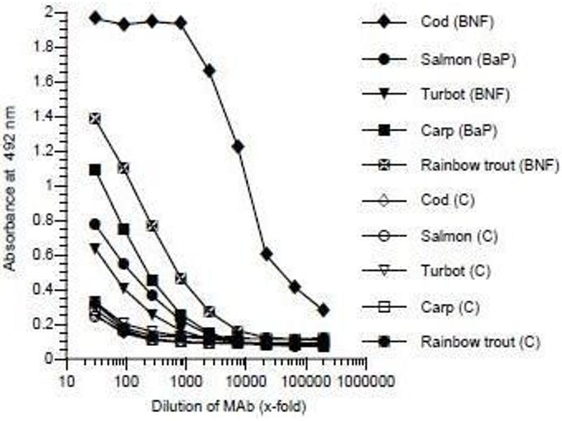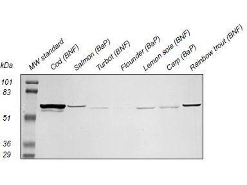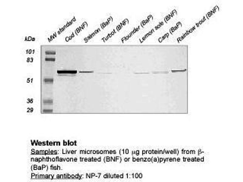 The antibody NP-7 cross-reacts with a petroleum/PAH /PCB/dioxin-inducible protein (mr = 55,000-59,000) in liver samples from a wide variety of different fish species from cod (Gadiformes), carp (Cypriniformes), salmon (Salmoniformes), and some flatfish (Pleuronectiformes) (see examples below) . The degree of cross-reactivity may differ between species and with the different methods employed.