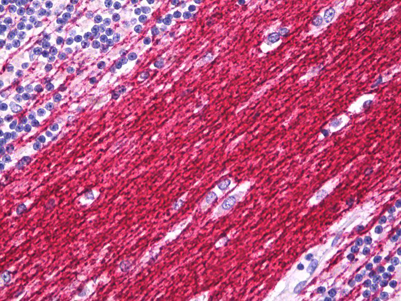 Usage: Suitable for use in Western Blot, Immunocytochemistry and Immunohistochemistry. Western Blot: Can aggregate causing HMW bands to sometimes appear in certain preparations. Immunocytochemistry: 4 % PFA fixed cells for 5-10 minutes at RT. Use 0.1 % triton in block only to allow antibody access to C-terminal epitope. Immunohistochemistry (Frozen): Fresh frozen sections or 4 % PFA fixed, frozen tissues. Epitope is internal, use 0.1-0.2 % triton X-100 in the blocking step for permeabilization. Immunohistochemistry (Paraffin): Works best with lightly fixed tissues, or Bouin's fixed material, although there are reports of traditional formalin fixation also working with antigen recovery. Positive control: Brain.