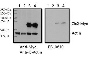 Usage: Peptide ELISA: antibody detection limit dilution 1:1000. Western blot: In transfected RWPE1 transiently expressing Human ZIC2-Myc a band of approx. 65kD is observed. This band is not observed in the non-transfected RWPE1, nor when GFP is transiently expressed. The calculated molecular size is 55.0kD according to NP_009060.2 and 58.6kD for the ZIC2-Myc protein. Data provided by Nathan Bowen and Maryam Boseman, Clark Atlanta University, GA, USA. We have observed an approx 75kD band in Human Brain (Cerebellum and Cerebral Cortex) lysates Recommended concentration, 0.5-2 μg/mL. -