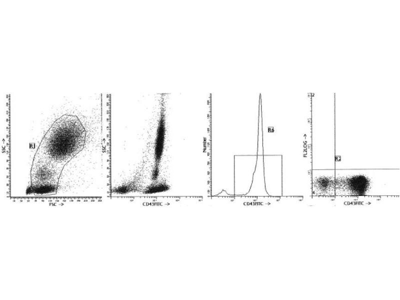 - CD43 antigen is expressed on all T cells, NK cells, myeloid cells and monocytes as well as on CD5 positive mature B cells. It is also present on all immature hematopoietic cells in the bone marrow [1]. The antigen is deficient in patients with Wiskott-Aldrich syndrome. A soluble form of CD43 is present in human serum [2]. CD43 may function as an adhesion molecule via interaction with CD54 although this has not been definitely established. It may also inhibit leucocyte interactions with other cells [6]. The antigen is involved in the activation of T-cells, B cells, NK cells and monocytes [5]. The membrane proximal portion of the cytoplasmic domain mediates an association with the cytoskeleton [1].Synonyms: Galactoglycoprotein, Leukocyte sialoglycoprotein, SPN, Sialophorin
