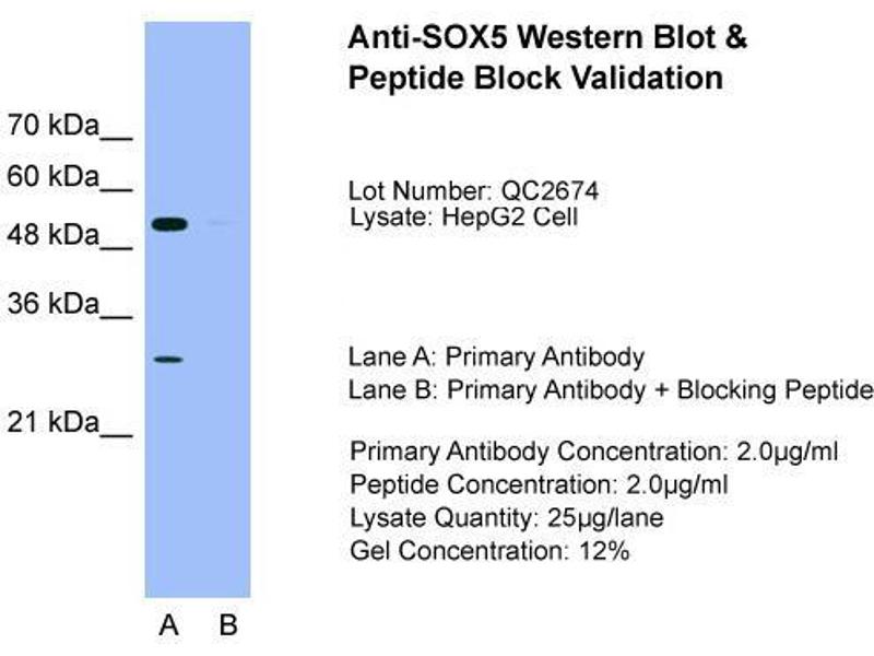 SOX5 encodes a member of the SOX (SRY-related HMG-box) family of transcription factors involved in the regulation of embryonic development and in the determination of the cell fate. The encoded protein may act as a transcriptional regulator after forming a protein complex with other proteins. The encoded protein may play a role in chondrogenesis. A pseudogene of this gene is located on chromosome 8.Synonyms: L-SOX5, SRY (sex determining region Y)-box 5, SRY-box 5, Transcription factor SOX-5