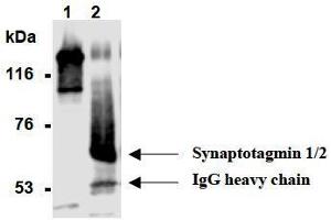 This antibody reacts with Synaptotagmin 1 and 2 (58 kDa/60 kDa) on Western blotting. Synaptotagmin 1 has a predicted molecular weight of 47 kDa but it migrates at ~65 kDa. It is reported that this clone (1D12) recognizes rat synaptotagmin residues (99-104 aa) in the reference number 17).