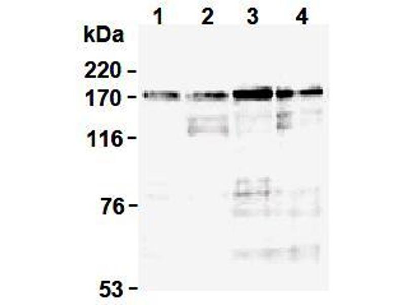 This antibody reacts with Topo IIa and ß. The antibody detects 170 KD of human Topo IIa and 180 KD of human Topo IIß on Western blot with whole cell lysate.