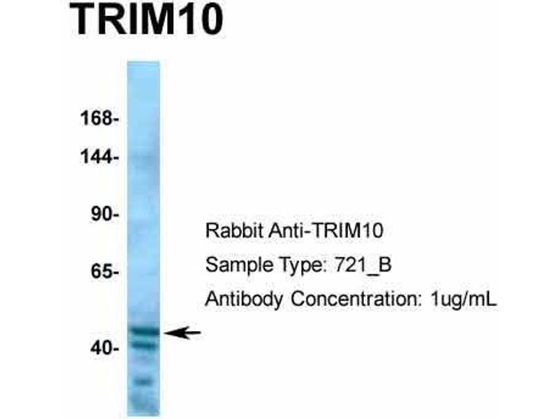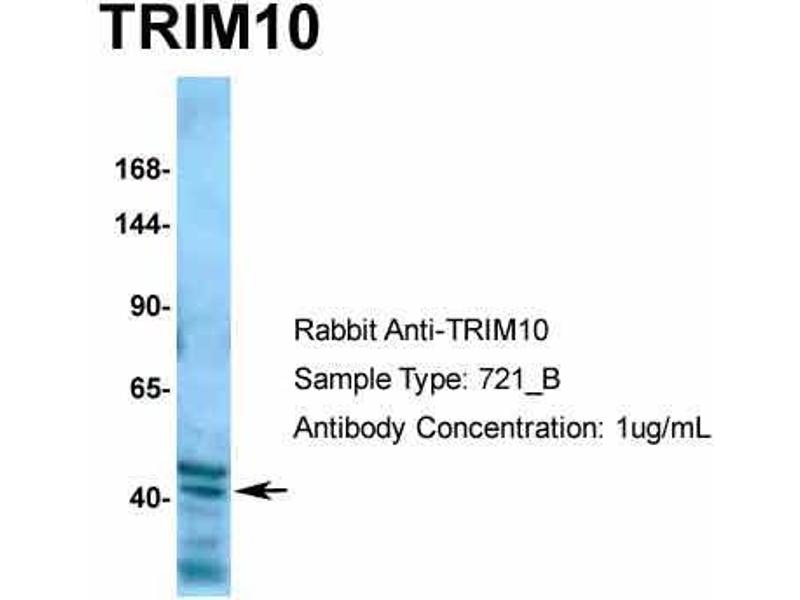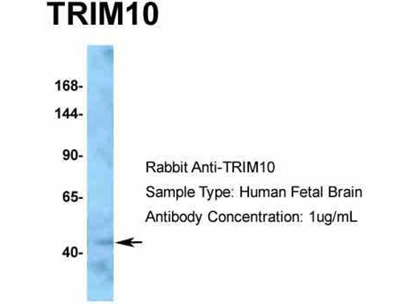 The Rabbit Polyclonal anti-TRIM10 antibody has been validated for WB. It is suitable to detect TRIM10 in samples from Human, Mouse, Cow and Pig.