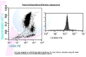 - Transfer 100 µl of anticoagulated (EDTA) blood to a 12 x 75 mm polystyrene test tube (10^6 cells). 2. Add 20 µl of CD49c PE and mix gently with a vortex mixer. The 20 µl is a guideline only, the optimal volume should be determined by the individual laboratory. 3. The recommended negative control is a non-reactive PE-conjugated antibody of the same isotype. 4. Incubate in the dark at room temperature at 4°C for 30 minutes or at room temperature (20-25 °C) for 15 minutes. 5. Add 1,5 ml of Lysing Solution to each sample and mix gently with a vortex mixer. Incubate for 10 minutes at room temperature in the dark. 6. Centrifuge at 1000 x g for 5 minutes. Gently aspirate the supernatant and discard it leaving approximately 50 µl of fluid. 7. Add 2 ml 0.01 mol/l PBS (It better that it containing 2% bovine serum albumin) and resuspend the cells by using a vortex mixer.8. Centrifuge at 1000 x g for 5 minutes. Gently aspirate the supernatant and discard it leaving approximately 50 µl of fluid. 9. Resuspend pellet in an appropriate fluid for flow cytometry, e.g. 0.3 ml PBS. The PBS should contain 1% paraformaldehyde (fixative) if samples are not analysed the same day. 10. Analyse on a flow cytometer or store at 2-8 °C in the dark until analysis. Samples can be run up to 24 hours after lysis.