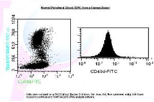 - Transfer 100 µl of anticoagulated (EDTA) blood to a 12 x 75 mm polystyrene test tube (10^6 cells). 2. Add 20 µl of CD49d FITC and mix gently with a vortex mixer. The 20 µl is a guideline only, the optimal volume should be determined by the individual laboratory. 3. The recommended negative control is a non-reactive FITC-conjugated antibody of the same isotype. 4. Incubate in the dark at room temperature at 4°C for 30 minutes or at room temperature (20-25 °C) for 15 minutes. 5. Add 1,5 ml of Lysing Solution to each sample and mix gently with a vortex mixer. Incubate for 10 minutes at room temperature in the dark. 6. Centrifuge at 1000 x g for 5 minutes. Gently aspirate the supernatant and discard it leaving approximately 50 µl of fluid. 7. Add 2 ml 0.01 mol/l PBS (It better that it containing 2% bovine serum albumin) and resuspend the cells by using a vortex mixer. 8. Centrifuge at 1000 x g for 5 minutes. Gently aspirate the supernatant and discard it leaving approximately 50 µl of fluid. 9. Resuspend pellet in an appropriate fluid for flow cytometry, e.g. 0.3 ml PBS. The PBS should contain 1% paraformaldehyde (fixative) if samples are not analysed the same day. 10. Analyse on a flow cytometer or store at 2-8 °C in the dark until analysis. Samples can be run up to 24 hours after lysis. Normal Blood Sample from a Human Donor