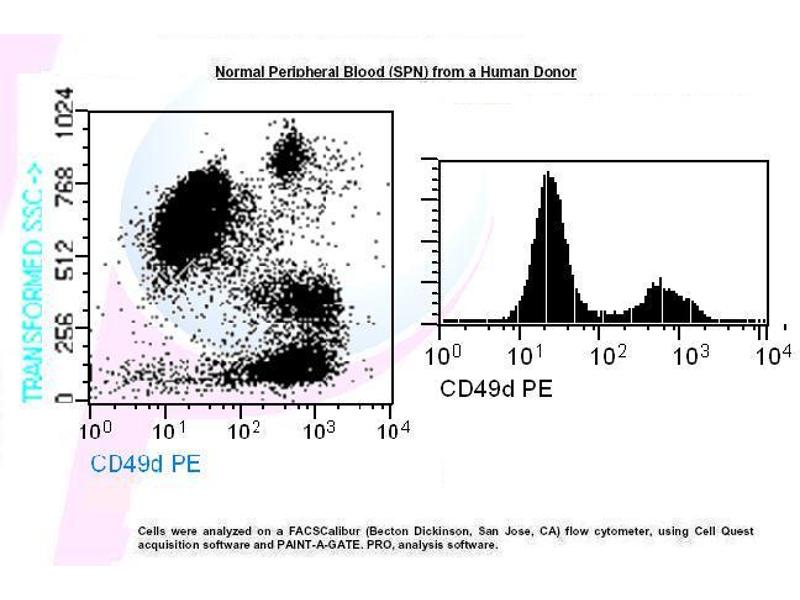 - Transfer 100 µl of anticoagulated (EDTA) blood to a 12 x 75 mm polystyrene test tube (10^6 cells). 2. Add 20 µl of CD49d PE and mix gently with a vortex mixer. The 20 µl is a guideline only, the optimal volume should be determined by the individual laboratory. 3. The recommended negative control is a non-reactive PE-conjugated antibody of the same isotype. 4. Incubate in the dark at room temperature at 4°C for 30 minutes or at room temperature (20-25 °C) for 15 minutes. 5. Add 1,5 ml of Lysing Solution to each sample and mix gently with a vortex mixer. Incubate for 10 minutes at room temperature in the dark. 6. Centrifuge at 1000 x g for 5 minutes. Gently aspirate the supernatant and discard it leaving approximately 50 µl of fluid. 7. Add 2 ml 0.01 mol/l PBS (It better that it containing 2% bovine serum albumin) and resuspend the cells by using a vortex mixer. 8. Centrifuge at 1000 x g for 5 minutes. Gently aspirate the supernatant and discard it leaving approximately 50 µl of fluid. 9. Resuspend pellet in an appropriate fluid for flow cytometry, e.g. 0.3 ml PBS. The PBS should contain 1% paraformaldehyde (fixative) if samples are not analysed the same day. 10. Analyse on a flow cytometer or store at 2-8 °C in the dark until analysis. Samples can be run up to 24 hours after lysis.