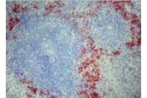Immunohistchemistry on Frozen Sections: 0.5 μg/mL (1/600). Does not react on routinely processed Paraffin sections. Recommended Positive Control: Mouse spleen. Has been described to work in FACS.