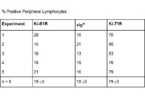 Suitable for Immunohistochemistry (IHC) and FACS. Frozen sections: 0.25 μg/mL (1/800). Ki-T1R shows very charateristic staining patterns in lymphoid organs according to the T-celldistribution, paracortical T-cell zone of lymphnodes, periarteriolar T-cell zones of thespleen, T-cell nodules of the gastrointestinal tract and bone marrow, thymocytes withprevalence from thymus medulla.