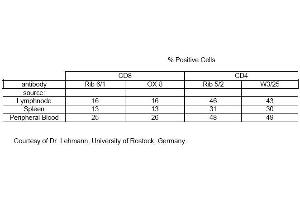 Immunohistochemistry on frozen sections (1 μg/mL, 1: 200). Suggested positive control: rat spleen. Does not react on routinely processed paraffin sections. Flow cytometry (use 10 μL of neat antibody to label 10^6 cells).