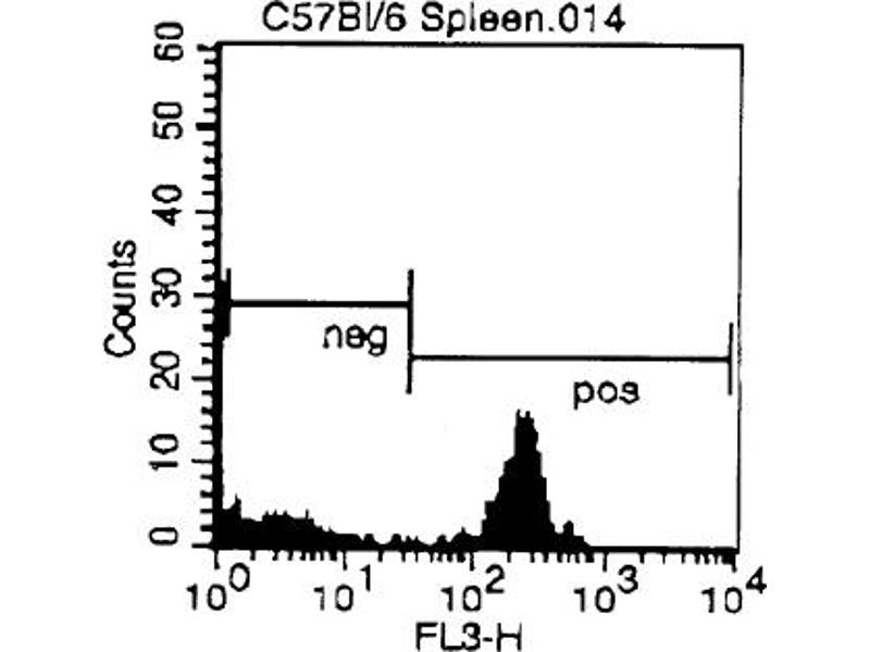 - FLOW CYTOMETRY ANALYSIS: 1. Prepare a cell suspension in media A. For cell preparations, deplete the red blood cellpopulation with Lympholyte®-M cell separation medium. 2. Wash 2 times. 3. Resuspend the cells to a concentration of 2x10e7 cells/ml in media A. Add 50 µl of thissuspension to each tube (each tube will then contain 1 x 10e6 cells, representing 1 test). 4. To each tube, add ~1. 0-0. 5 µg of this Ab per 10e6 cells. 5. Vortex the tubes to ensure thorough mixing of antibody and cells. 6. Incubate the tubes for 30 minutes at 4°C. 7. Wash 2 times at 4°C. 8. Add 100 µl of (Streptavidin-PE) at a 1: 20 dilution. 9. Incubate tubes at 4°C for 30 - 60 minutes (It is recommended that tubes are protectedfrom light since most fluorochromes are light sensitive). 10. Wash 2 times at 4°C. 11. Resuspend the cell pellet in 50 µl ice cold media B. 12. Transfer to suitable tubes for flow cytometric analysis containing 15 µl of propidiumiodide at 0. 5 mg/ml in PBS. This stains dead cells by intercalating in DNA. MEDIA: A. Phosphate buffered saline (pH 7. 2) + 5% normal serum of host species + sodium azide(100 µl of 2M sodium azide in 100 mls). B. Phosphate buffered saline (pH 7. 2) + 0. 5% Bovine serum albumin + sodium azide (100µl of 2M sodium azide in 100 mls).