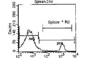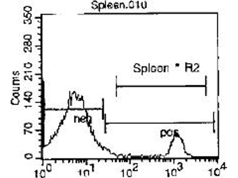 - FLOW CYTOMETRY ANALYSIS: Method: 1. Prepare a cell suspension in media A. For cell preparations, deplete the red blood cellpopulation with Lympholyte®-M cell separation medium. 2. Wash 2 times. 3. Resuspend the cells to a concentration of 2x10e7 cells/ml in media A. Add 50 µl of thissuspension to each tube (each tube will then contain 1x10e6 cells, representing 1 test). 4. To each tube, add ~0. 5 µg* of this Ab. 5. Vortex the tubes to ensure thorough mixing of antibody and cells. 6. Incubate the tubes for 30 minutes at 4°C. (It is recommended that the tubes areprotected from light, since most fluorochromes are light sensitive. )7. Wash 2 times at 4°C. 8. Resuspend the cell pellet in 50 µl ice cold media B. 9. Transfer to suitable tubes for flow cytometric analysis containing 15 µl of propidiumiodide at 0. 5 mg/ml in PBS. This stains dead cells by intercalating in DNA. Media: A. Phosphate buffered saline (pH 7. 2) + 5% normal serum of host species + sodium azide(100 µl of 2M sodium azide in 100 mls). B. Phosphate buffered saline (pH 7. 2) + 0. 5% Bovine serum albumin + sodium azide (100µl of 2M sodium azide in 100 mls). Results: Mouse Strain: BALB/cCell Concentration: 1 x 10e6 cells per testAntibody Concentration Used: 0. 5 μg/10e6 cellsIsotypic Control: APC Rat IgG2a
