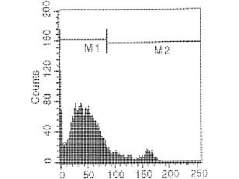- FLOW CYTOMETRY ANALYSIS: Method: 1. Prepare a cell suspension in media A. For cell preparations, deplete the red blood cellpopulation with Lympholyte®-M cell separation medium. 2. Wash 2 times. 3. Resuspend the cells to a concentration of 2x10e7 cells/ml in media A. Add 50 µl of thissuspension to each tube (each tube will then contain 1 x 10e6 cells, representing 1 test). 4. To each tube, add ~1. 0 µg*of this Ab per 1x10e6 cells. 5. Vortex the tubes to ensure thorough mixing of antibody and cells. 6. Incubate the tubes for 30 minutes at 4°C. (It is recommended that the tubes areprotected from light, since most fluorochromes are light sensitive. )7. Wash 2 times at 4°C. 8. Resuspend the cell pellet in 50 µl ice cold media B. 9. Transfer to suitable tubes for flow cytometric analysis containing 15 µl of propidiumiodide at 0. 5 mg/ml in PBS. This stains dead cells by intercalating in DNA. Media: A. Phosphate buffered saline (pH 7. 2) + 5% normal serum of host species + sodium azide(100 µl of 2M sodium azide in 100 mls). B. Phosphate buffered saline (pH 7. 2) + 0. 5% Bovine serum albumin + sodium azide (100µl of 2M sodium azide in 100 mls). Results: Mouse Strain: BALB/cCell Concentration: 1x10e6 cells per testAntibody Concentration Used: 1. 0 µg/10e6 cells