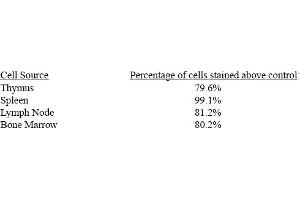 - FLOW CYTOMETRY ANALYSIS: Method: 1. Prepare a cell suspension in media A. For cell preparations, deplete the red blood cellpopulation with Lympholyte®-M cell separation medium. 2. Wash 2 times. 3. Resuspend the cells to a concentration of 2x10e7 cells/ml in media A. Add 50 µl of thissuspension to each tube (each tube will then contain 1x10e6 cells, representing 1 test). 4. To each tube, add 0. 5 µg* of this Ab. 5. Vortex the tubes to ensure thorough mixing of antibody and cells. 6. Incubate the tubes for 30 minutes at 4°C. 7. Wash 2 times at 4°C. 8. Add 100 µl of secondary antibody (FITC Goat anti-rat IgG (H+L)) at 1/500 dilution. 9. Incubate the tubes at 4°C for 30-60 minutes. (It is recommended that the tubes areprotected from light since most fluorochromes are light sensitive). 10. Wash 2 times at 4°C in media B. 11. Resuspend the cell pellet in 50 µl ice cold media B. 12. Transfer to suitable tubes for flow cytometric analysis containing 15 µl of propidiumiodide at 0. 5 mg/ml in PBS. This stains dead cells by intercalating in DNA. Media: A. Phosphate buffered saline (pH 7. 2) + 5% normal serum of host species + sodium azide(100 µl of 2M sodium azide in 100 mls). B. Phosphate buffered saline (pH 7. 2) + 0. 5% Bovine serum albumin + sodium azide (100µl of 2M sodium azide in 100 mls). Results - Tissue Distribution: Mouse Strain: BALB/cCell Concentration: 1x10e6 cells per testAntibody Concentration Used: 0. 5 µg/10e6 cellsIsotypic Control: Rat IgG2aResults - Strain Distribution: Cell Concentration: 1x10e6 cells per testAntibody Concentration Used: 0. 5 µg/10e6 cellsStrains Tested: BALB/C, CBA/J, C3H/He, C57BL/6, SWRPositive: BALB/C, CBA/J, C3H/He, C57BL/6, SWRNegative: none