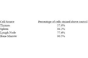 - FLOW CYTOMETRY ANALYSIS: Method: 1. Prepare a cell suspension in media A. For preparations, deplete the red blood cellpopulation with Lympholyte®-M cell separation medium. 2. Wash 2 times. 3. Resuspend the cells to a concentration of 2x10e7 cells/ml in media A. Add 50 µl of thissuspension to each tube (each tube will then contain 1 x 10e6 cells, representing 1 test). 4. To each tube, add 1. 0 - 0. 5 µg* of this Ab per 10e6 cells. 5. Vortex the tubes to ensure thorough mixing of antibody and cells. 6. Incubate the tubes for 30 minutes at 4°C. (It is recommended that the tubes areprotected from light, since most fluorochromes are light sensitive. )7. Wash 2 times at 4°C. 8. Resuspend the cell pellet in 50 µl ice cold media B. 9. Transfer to suitable tubes for flow cytometric analysis containing 15 µl of propidiumiodide at 0. 5 mg/ml in PBS. This stains dead cells by intercalating in DNA. Media: A. Phosphate buffered saline (pH 7. 2) + 5% normal serum of host species + sodium azide(100 µl of 2M sodium azide in 100 mls). B. Phosphate buffered saline (pH 7. 2) + 0. 5% Bovine serum albumin + sodium azide (100µl of 2M sodium azide in 100 mls). Results - Tissue Distribution: Mouse Strain: BALB/cCell Concentration: 1x10e6 cells per testAntibody Concentration Used: 0. 5 µg/10e6 cellsIsotypic Control: FITC Rat IgG2aResults - Strain Distribution: Cell Concentration: 1x10e6 cells per testAntibody Concentration Used: 0. 5 µg /10e6 cellsStrains Tested: BALB/c, CBA/J, C3H/He, C57BL/6, SWRPositive: BALB/c, CBA/J, C3H/He, C57BL/6, SWRNegative: noneIMMUNOHISTOCHEMISTRY: