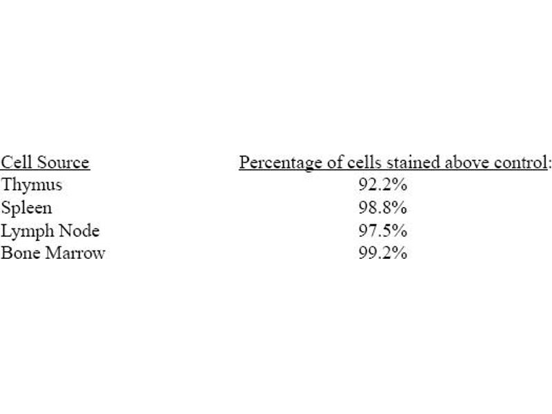 - FLOW CYTOMETRY ANALYSIS: Method: 1. Prepare a cell suspension in media A. For cell preparations, deplete the red blood cellpopulation with Lympholyte®-M cell separation medium. 2. Wash 2 times. 3. Resuspend the cells to a concentration of 2x10e7 cells/ml in media A. Add 50 µl of thissuspension to each tube (each tube will then contain 1 x 10e6 cells, representing 1 test). 4. To each tube, add 1. 0 - 0. 5 µg* of this Ab per 10e6 cells. 5. Vortex the tubes to ensure thorough mixing of antibody and cells. 6. Incubate the tubes for 30 minutes at 4°C. (It is recommended that the tubes areprotected from light, since most fluorochromes are light sensitive. )7. Wash 2 times at 4°C. 8. Resuspend the cell pellet in 50 µl ice cold media B. 9. Transfer to suitable tubes for flow cytometric analysis containing 15 µl of propidiumiodide at 0. 5 mg/ml in PBS. This stains dead cells by intercalating in DNA. Media: A. Phosphate buffered saline (pH 7. 2) + 5% normal serum of host species + sodium azide(100 µl of 2M sodium azide in 100 mls). B. Phosphate buffered saline (pH 7. 2) + 0. 5% Bovine serum albumin + sodium azide (100µl of 2M sodium azide in 100 mls). Results - Tissue Distribution: Mouse Strain: BALB/cCell Concentration: 1x10e6 cells per testAntibody Concentration Used: 0. 5 µg/10e6 cellsIsotypic Control: PE Rat IgG2aResults - Strain Distribution: Cell Concentration: 1x10e6 cells per testAntibody Concentration Used: 0. 5 µg /10e6 cellsStrains Tested: BALB/c, CBA/J, C3H/He, C57BL/6, SWRPositive: BALB/c, CBA/J, C3H/He, C57BL/6, SWRNegative: none
