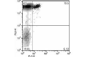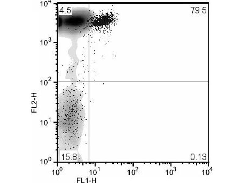 FLOW CYTOMETRY ANALYSIS: Method: 1. Prepare a cell suspension in media A. For cell preparations, deplete the red blood cellpopulation. 2. Wash 2 times. 3. Resuspend the cells to a concentration of 2x10e7 cells/ml in media A. Add 50 µl of thissuspension to each tube (each tube will then contain 1 x 10e6 cells, representing 1 test). 4. To each tube, add ~0. 25 µg of antibody per 1 x 10e6 cells. 5. Vortex the tubes to ensure thorough mixing of antibody and cells. 6. Incubate the tubes for 30 minutes at 4°C. (It is recommended that the tubes areprotected from light, since most fluorochromes are light sensitive. )7. Wash 2 times at 4°C. 8. Resuspend the cell pellet in 50 µl ice cold media B. 9. Transfer to suitable tubes for flow cytometric analysis containing 15 µl of propidiumiodide at 0. 5 mg/ml in PBS. This stains dead cells by intercalating in DNA. Media: A. Phosphate buffered saline (pH 7. 2) + 5% normal serum of host species + sodium azide(100 µl of 2M sodium azide in 100 mls). B. Phosphate buffered saline (pH 7. 2) + 0. 5% Bovine serum albumin + sodium azide (100µl of 2M sodium azide in 100 mls).