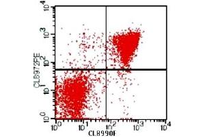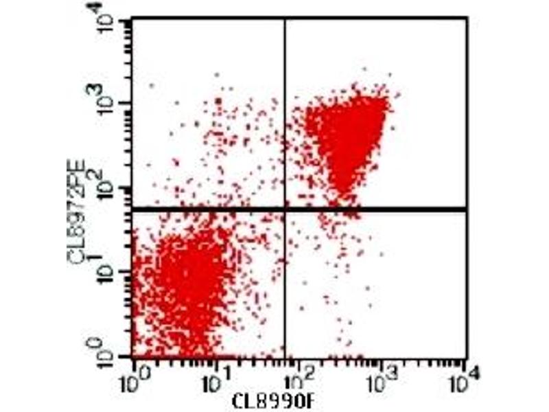 FLOW CYTOMETRY ANALYSIS: Method: 1. Prepare a cell suspension in media A. For cell preparations, deplete the red blood cellpopulation with Lympholyte®-M cell separation medium. 2. Wash 2 times. 3. Resuspend the cells to a concentration of 2x10e7 cells/ml in media A. Add 50 µl of thissuspension to each tube (each tube will then contain 1 x 10e6 cells, representing 1 test). 4. To each tube, add ~0. 25 µg* of this Ab per 10e6 cells. 5. Vortex the tubes to ensure thorough mixing of antibody and cells. 6. Incubate the tubes for 30 minutes at 4°C. (It is recommended that the tubes areprotected from light, since most fluorochromes are light sensitive. )7. Wash 2 times at 4°C. 8. Resuspend the cell pellet in 50 µl ice cold media B. 9. Transfer to suitable tubes for flow cytometric analysis containing 15 µl of propidiumiodide at 0. 5 mg/ml in PBS. This stains dead cells by intercalating in DNA. Media: A. Phosphate buffered saline (pH 7. 2) + 5% normal serum of host species + sodium azide(100 µl of 2M sodium azide in 100 mls). B. Phosphate buffered saline (pH 7. 2) + 0. 5% Bovine serum albumin + sodium azide (100µl of 2M sodium azide in 100 mls).
