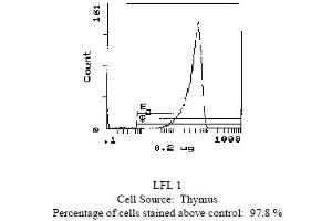 - FLOW CYTOMETRY ANALYSIS: Method: 1. Prepare a cell suspension in media A. For cell preparations, deplete the red blood cellpopulation. 2. Wash 2 times. 3. Resuspend the cells to a concentration of 2x10e7 cells/ml in media A. Add 50 µl of thissuspension to each tube (each tube will then contain 1 x 10e6 cells, representing 1 test). 4. To each tube, add 0. 2-0. 5 µg of this antibody per 10e6 cells. 5. Vortex the tubes to ensure thorough mixing of antibody and cells. 6. Incubate the tubes for 30 minutes at 4°C. 7. Wash 2 times at 4°C. 8. Add 100 µl of secondary antibody (Streptavidin-FITC) at a 1/500 dilution. 9. Incubate tubes at 4°C for 30-60 minutes (It is recommended that tubes are protectedfrom light since most fluorochromes are light sensitive). 10. Wash 2 times at 4°C. 11. Resuspend the cell pellet in 50 µl ice cold media B. 12. Transfer to suitable tubes for flow cytometric analysis containing 15 µl of propidiumiodide at 0. 5 mg/ml in PBS. This stains dead cells by intercalating in DNA. Media: A. Phosphate buffered saline (pH 7. 2) + 5% normal serum of host species + sodium azide(100 µl of 2M sodium azide in 100 mls). B. Phosphate buffered saline (pH 7. 2) + 0. 5% Bovine serum albumin + sodium azide (100µl of 2M sodium azide in 100 mls). Results: Tissue Distribution by Flow Cytometry Analysis: Mouse Strain: CBA/JCell Concentration : 1x10e6 cells per testsAntibody Concentration Used: 0. 2 µg/10e6 cellsIsotypic Control: Biotin Mouse IgG2b,kCell Source: Percentage of cells stained above control: Thymus: 97. 8%Spleen: 35. 4%