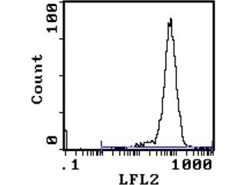 - FLOW CYTOMETRY ANALYSIS: Method: 1. Prepare a cell suspension in media A. For cell preparations, deplete the red blood cellpopulation with Lympholyte®-M cell separation medium. 2. Wash 2 times. 3. Resuspend the cells to a concentration of 2x10e7 cells/ml in media A. Add 50 µl of thissuspension to each tube (each tube will then contain 1x10e6 cells, representing 1 test). 4. To each tube, add 0. 5 µg* of this Ab. 5. Vortex the tubes to ensure thorough mixing of antibody and cells. 6. Incubate the tubes for 30 minutes at 4°C. (It is recommended that the tubes areprotected from light, since most fluorochromes are light sensitive. )7. Wash 2 times at 4°C. 8. Resuspend the cell pellet in 50 µl ice cold media B. 9. Transfer to suitable tubes for flow cytometric analysis containing 15 µl of propidiumiodide at 0. 5 mg/ml in PBS. This stains dead cells by intercalating in DNA. Media: A. Phosphate buffered saline (pH 7. 2) + 5% normal serum of host species + sodium azide(100 µl of 2M sodium azide in 100 mls). B. Phosphate buffered saline (pH 7. 2) + 0. 5% Bovine serum albumin + sodium azide (100µl of 2M sodium azide in 100 mls). Results - Tissue Distribution: Mouse Strain: BALB/cCell Concentration: 1x10e6 cells per testAntibody Concentration Used: 0. 5 µg/10e6 cellsIsotypic Control: PE-Mouse IgG2b,kCell Source Percentage of cells stained above control: Thymus: 98. 4%Spleen: 28. 8%Results - Strain Distribution: Cell Concentration: 1x10e6 cells per testAntibody Concentration Used: 0. 5 µg/10e6 cellsStrains Tested: C57BL/6, C3H/He, CBA/J, BALB/c, ATL, AKR/JPositive: C57BL/6, C3H/He, CBA/J, BALB/c, ATLNegative: AKR/J