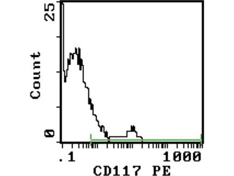 This monoclonal antibody recognizes the receptor tyrosine kinase, c-kit. The ligand for this receptor is steel factor (stem cell factor), which exists in both soluble and membrane form. The interaction between steel factor and c-kit is essential for the development of hematopoietic, gonadal and pigment stem cells. c-kit positive cells are a subset of CD34+ hematopoietic precursor cells and it is expressed on 5-10 % of total adult bone marrow cells.