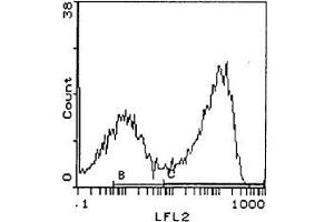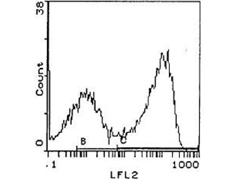 - FLOW CYTOMETRY ANALYSIS: Method: 1. Prepare a cell suspension in media A. For cell preparations, deplete the red blood cellpopulation. 2. Wash 2 times. 3. Resuspend the cells to a concentration of 2x10e7 cells/ml in media A. Add 50 μl of thissuspension to each tube (each tube will then contain 1 x 10e6 cells, representing 1 test). 4. To each tube, add 0. 2 - 0. 1 μg of ABIN114360 per 10e6 cells. 5. Vortex the tubes to ensure thorough mixing of antibody and cells. 6. Incubate the tubes for 30 minutes at 4°C. (It is recommended that the tubes are protected from light, since most fluorochromes arelight sensitive. )7. Wash 2 times at 4°C. 8. Resuspend the cell pellet in 50 μl ice cold media B. 9. Transfer to suitable tubes for flow cytometric analysis containing 15 μl ofepropidiumiodide at 0. 5 mg/ml in PBS. This stains dead cells by intercalating in DNA.