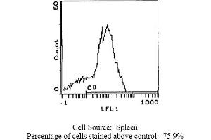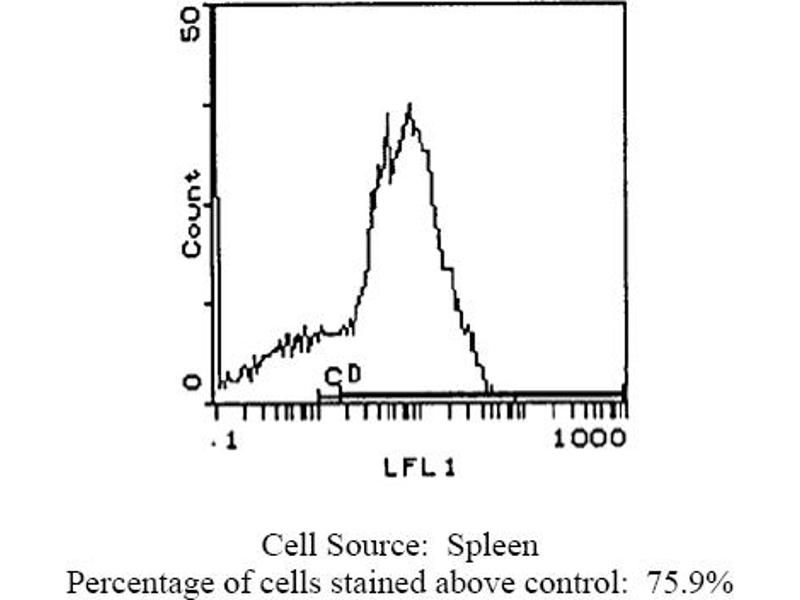 - FLOW CYTOMETRY ANALYSIS: Method: 1. Prepare a cell suspension in media A. For cell preparations, deplete the red blood cellpopulation with Rat cell separation medium. 2. Wash 2 times. 3. Resuspend the cells to a concentration of 2x10e7 cells/ml in media A. Add 50 µl of thissuspension to each tube (each tube will then contain 1x10e6 cells, representing 1 test). 4. To each tube, add 1. 0-0. 5 µg* of ABIN114364 or ABIN114364X. 5. Vortex the tubes to ensure thorough mixing of antibody and cells. 6. Incubate the tubes for 30 minutes at 4°C. (It is recommended that the tubes are protected from light since most fluorochromes arelight sensitive). 7. Wash 2 times at 4°C. 8. Resuspend the cell pellet in 50 µl ice cold media B. 9. Transfer to suitable tubes for flow cytometric analysis containing 15 µl of propidiumiodide at 0. 5 mg/ml in PBS. This stains dead cells by intercalating in DNA. Media: A. Phosphate buffered saline (pH 7. 2) + 5% normal serum of host species + sodium azide(100 µl of 2M sodium azide in 100 mls). B. Phosphate buffered saline (pH 7. 2) + 0. 5% Bovine serum albumin + sodium azide (100µl of 2M sodium azide in 100 mls). Results-Tissue Distribution: Rat Strain: WistarCell Concentration: 1 x 10e6 cells per testsAntibody Concentration Used: 1. 0 µg/10e6 cellsIsotypic Control: FITC Mouse IgG2a. Cell Source Percentage of cells stained above control: Thymus: 99. 6%Spleen: 75. 9%Lymph Node: 96. 8%N. B. Appropriate control samples should always be included in any labelling studies. * For optimal results in various applications, it is recommended that each investigatordetermine dilutions appropriate for individual use.