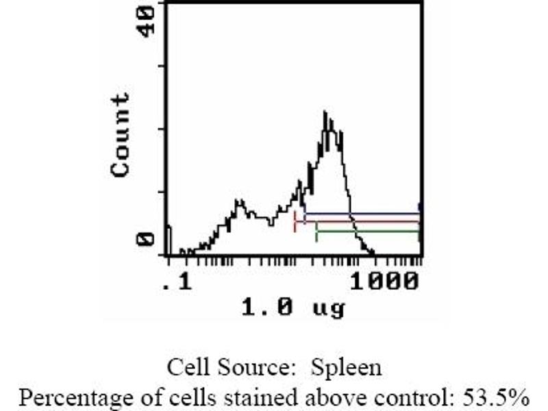 - FLOW CYTOMETRY ANALYSIS: Method: 1. Prepare a cell suspension in media A. For cell preparations, deplete the red blood cellpopulation with Rat cell separation medium. 2. Wash 2 times. 3. Resuspend the cells to a concentration of 2x10e7 cells/ml in media A. Add 50 µl of thissuspension to each tube (each tube will then contain 1x10e6 cells, representing 1 test). 4. To each tube, add 1. 0-0. 5 µg* of ABIN114366 or ABIN114366X. 5. Vortex the tubes to ensure thorough mixing of antibody and cells. 6. Incubate the tubes for 30 minutes at 4°C. 7. Wash 2 times at 4°C. 8. Add 100 µl of secondary antibody (FITC Goat anti-mouse IgG (H+L)) at 1: 500 dilution. 9. Incubate the tubes at 4°C for 30-60 minutes. (It is recommended that the tubes are protected from light since most fluorochromes arelight sensitive). 10. Wash 2 times at 4°C in media B. 11. Resuspend the cell pellet in 50 µl ice cold media B. 12. Transfer to suitable tubes for flow cytometric analysis containing 15 µl of propidiumiodide at 0. 5 mg/ml in PBS. This stains dead cells by intercalating in DNA. Media: A. Phosphate buffered saline (pH 7. 2) + 5% normal serum of host species + sodium azide(100 µl of 2M sodium azide in 100 mls). B. Phosphate buffered saline (pH 7. 2) + 0. 5% Bovine serum albumin + sodium azide (100µl of 2M sodium azide in 100 mls). Results-Tissue Distribution: Rat Strain: WistarCell Concentration: 1 x 10e6 cells per testsAntibody Concentration Used: 0. 2 µg/10e6 cellsIsotypic Control: Mouse IgG2a. Cell Source-Percentage of cells stained above control: Thymus: 82. 1%Spleen: 53. 5%Lymph Node: 87. 1%N. B. Appropriate control samples should always be included in any labelling studies. * For optimal results in various applications, it is recommended that each investigatordetermine dilutions appropriate for individual use.
