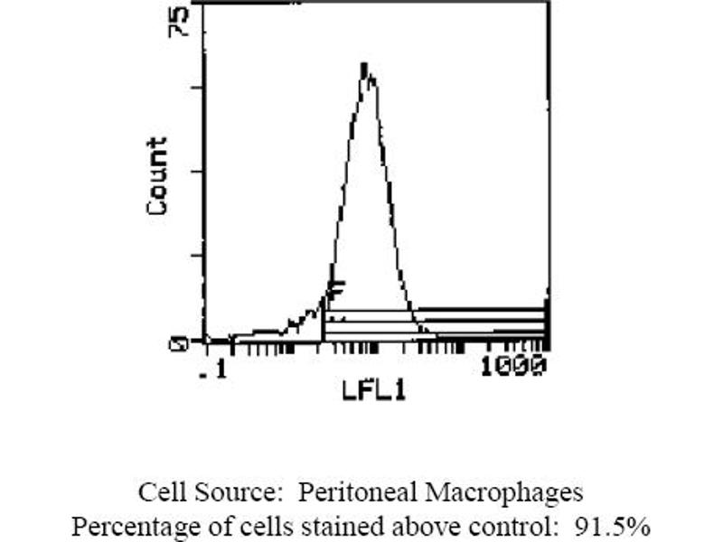 - FLOW CYTOMETRY ANALYSIS: Method: 1. Prepare a cell suspension in media A. For cell preparations, deplete the red blood cellpopulation with Lympholyte®-Rat cell separation medium. 2. Wash 2 times. 3. Resuspend the cells to a concentration of 2x10e7 cells/ml in media A. Add 50 µl of thissuspension to each tube (each tube will then contain 1 x 10e6 cells, representing 1 test). 4. To each tube, add 1. 0 µg of this Ab per 10e6 cells. 5. Vortex the tubes to ensure thorough mixing of antibody and cells. 6. Incubate the tubes for 30 minutes at 4°C. 7. Wash 2 times at 4°C. 8. Add 100 µl of secondary antibody (Streptavidin-FITC) at a 1: 500 dilution. 9. Incubate tubes at 4°C for 30 - 60 minutes (It is recommended that tubes are protectedfrom light since most fluorochromes are light sensitive). 10. Wash 2 times at 4°C. 11. Resuspend the cell pellet in 50 µl ice cold media B. 12. Transfer to suitable tubes for flow cytometric analysis containing 15 µl of propidiumiodide at 0. 5 mg/ml in PBS. This stains dead cells by intercalating in DNA. Media: A. Phosphate buffered saline (pH 7. 2) + 5% normal serum of host species + sodium azide(100 µl of 2M sodium azide in 100 mls). B. Phosphate buffered saline (pH 7. 2) + 0. 5% Bovine serum albumin + sodium azide (100µl of 2M sodium azide in 100 mls). Results - Tissue Distribution: Rat Strain: WistarCell Concentration: 1x10e6 cells per testAntibody Concentration Used: 1. 0 µg/10e6 cellsIsotypic Control: Biotin Mouse IgG1. Cell Source Percentage of cells stained above control: Peritoneal Macrophages: 91. 5%Thymus: 8. 9%Results - Strain Distribution: Antibody Concentration Used: 1. 0 µg/10e6 cellsStrains Tested: Wistar, Brown Norway, Buffalo, Fischr 344Positive: Wistar, Brown Norway, Buffalo, Fischr 344Negative: none