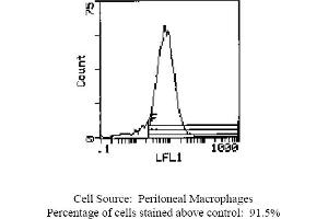 - FLOW CYTOMETRY ANALYSIS: Method: 1. Prepare a cell suspension in media A. For cell preparations, deplete the red blood cellpopulation with Lympholyte®-Rat cell separation medium. 2. Wash 2 times. 3. Resuspend the cells to a concentration of 2x10e7 cells/ml in media A. Add 50 µl of thissuspension to each tube (each tube will then contain 1 x 10e6 cells, representing 1 test). 4. To each tube, add 1. 0 µg of this Ab per 10e6 cells. 5. Vortex the tubes to ensure thorough mixing of antibody and cells. 6. Incubate the tubes for 30 minutes at 4°C. 7. Wash 2 times at 4°C. 8. Add 100 µl of secondary antibody (Streptavidin-FITC) at a 1: 500 dilution. 9. Incubate tubes at 4°C for 30 - 60 minutes (It is recommended that tubes are protectedfrom light since most fluorochromes are light sensitive). 10. Wash 2 times at 4°C. 11. Resuspend the cell pellet in 50 µl ice cold media B. 12. Transfer to suitable tubes for flow cytometric analysis containing 15 µl of propidiumiodide at 0. 5 mg/ml in PBS. This stains dead cells by intercalating in DNA. Media: A. Phosphate buffered saline (pH 7. 2) + 5% normal serum of host species + sodium azide(100 µl of 2M sodium azide in 100 mls). B. Phosphate buffered saline (pH 7. 2) + 0. 5% Bovine serum albumin + sodium azide (100µl of 2M sodium azide in 100 mls). Results - Tissue Distribution: Rat Strain: WistarCell Concentration: 1x10e6 cells per testAntibody Concentration Used: 1. 0 µg/10e6 cellsIsotypic Control: Biotin Mouse IgG1. Cell Source Percentage of cells stained above control: Peritoneal Macrophages: 91. 5%Thymus: 8. 9%Results - Strain Distribution: Antibody Concentration Used: 1. 0 µg/10e6 cellsStrains Tested: Wistar, Brown Norway, Buffalo, Fischr 344Positive: Wistar, Brown Norway, Buffalo, Fischr 344Negative: none